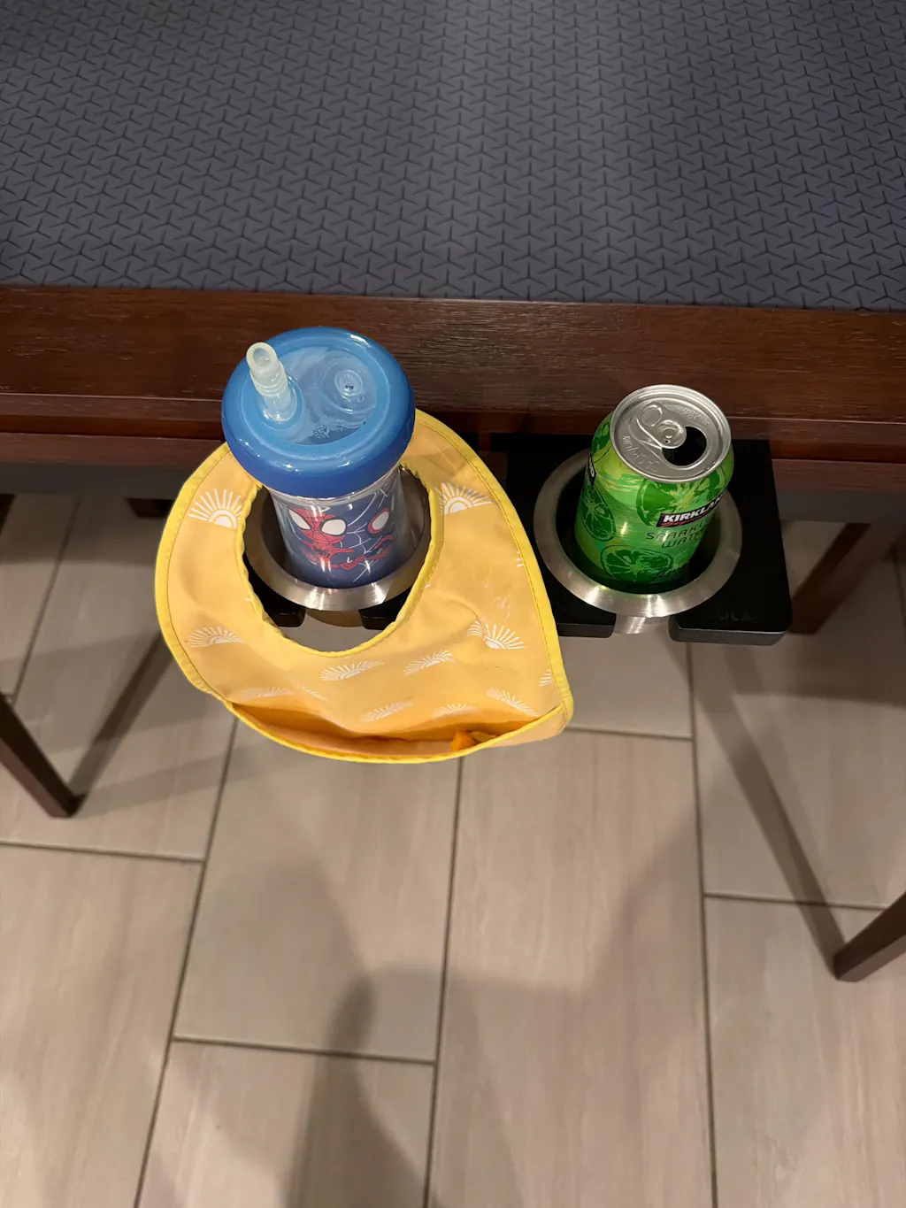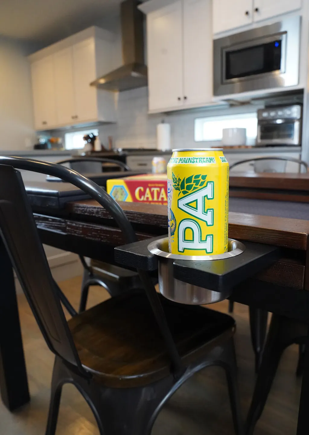 Magnetic cup holder with brushed aluminum insert. Attaches securely to accessory rails for a dedicated drink spot.