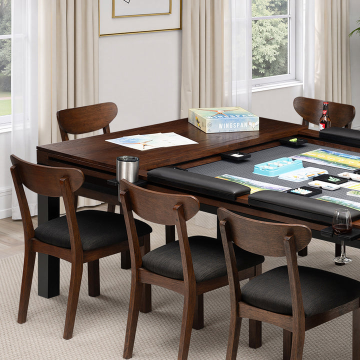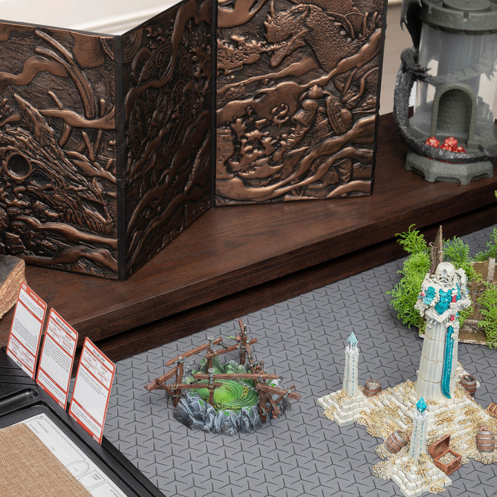 The Pangea Table Divider allows for unique table configurations, enabling you to keep table top leafs in place while creating segmented play areas. It ensures dice and game pieces stay in play, preventing them from getting lost under the table top. The divider's functionality seamlessly pairs with its aesthetic appeal. Equipped with the Omnitrack rail system, it offers additional space for storing gaming accessories. Ideal for gamers who value a customizable and organized gaming space, this divider elevates each gaming session with its adaptability and style.Features: